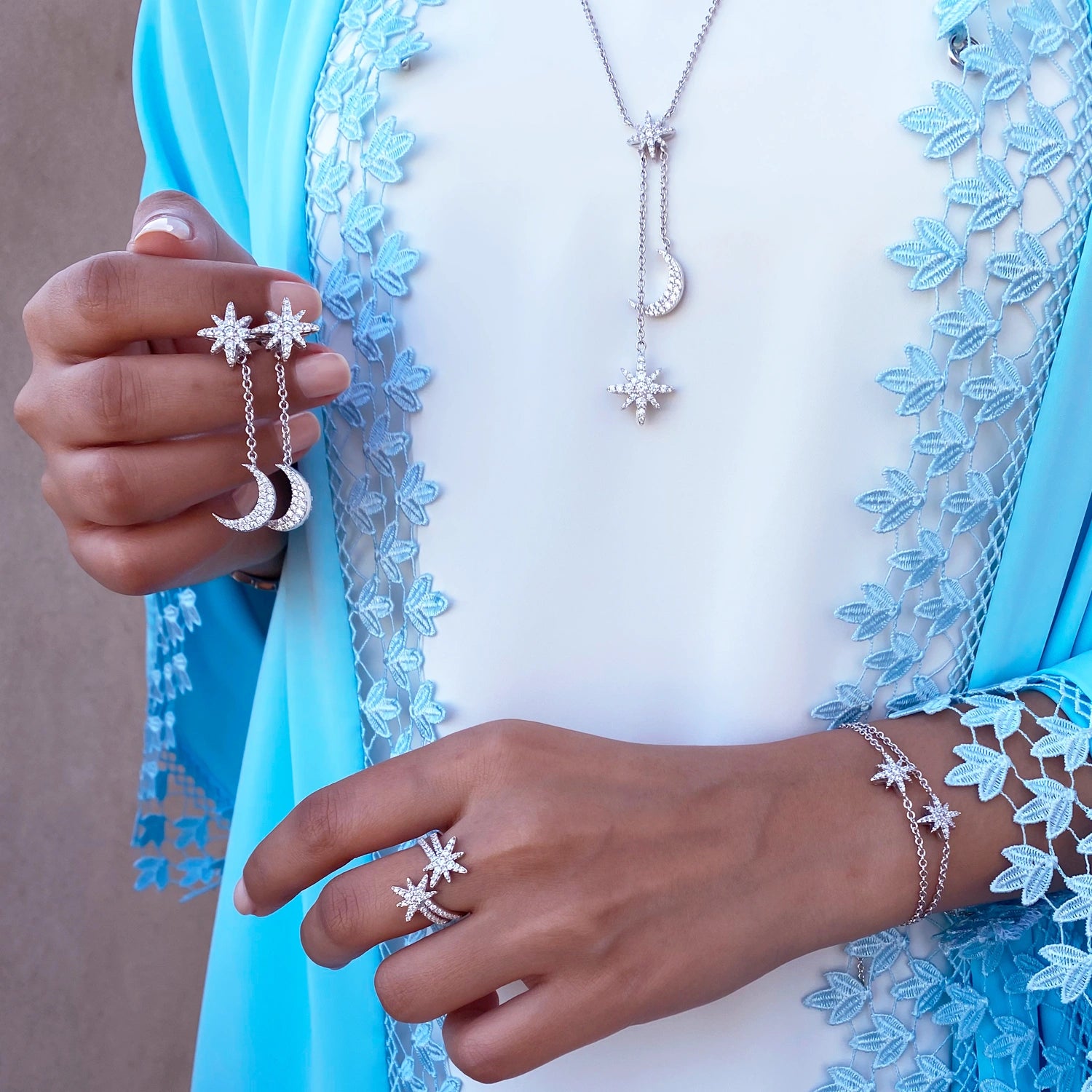 Inspired by starlit skies, this collection reflects the beauty of the night with luminous crystals that twinkle like stars and a graceful crescent moon as its signature touch.
