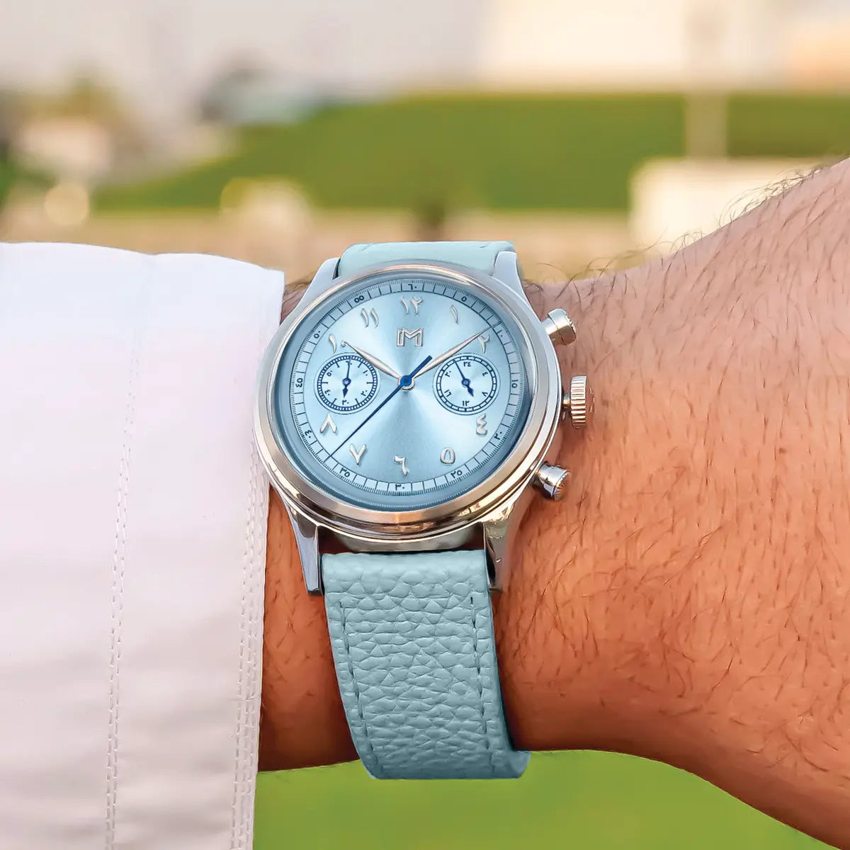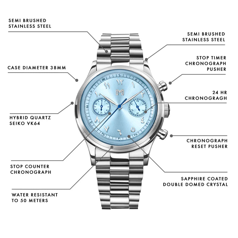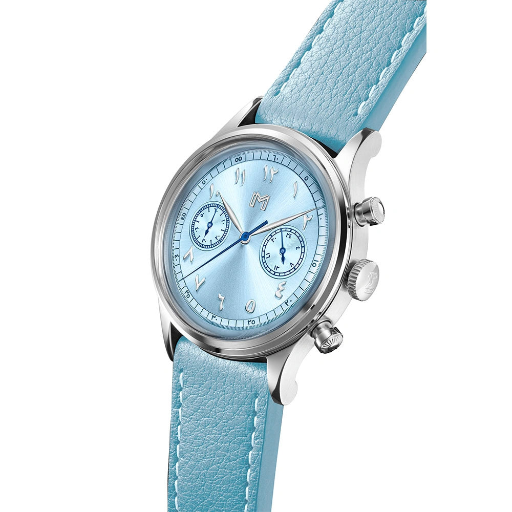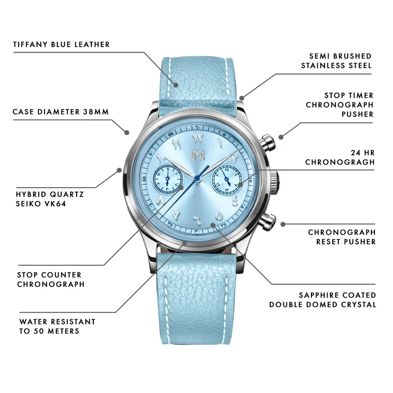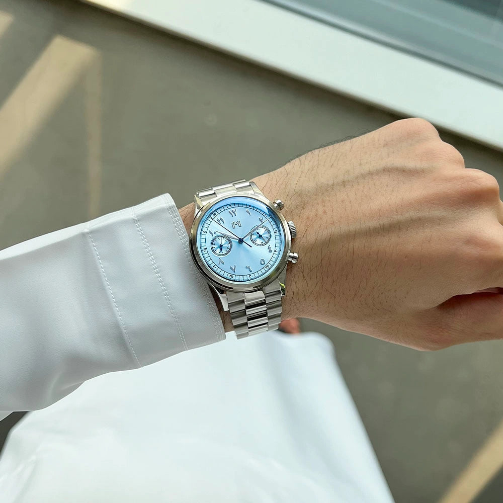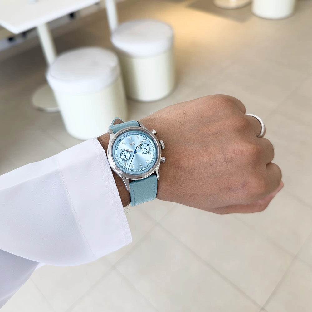A vintage-inspired chronograph watch featuring a mecha-quartz movement, interchangeable leather and steel straps, and a timeless design crafted for all-day comfort.