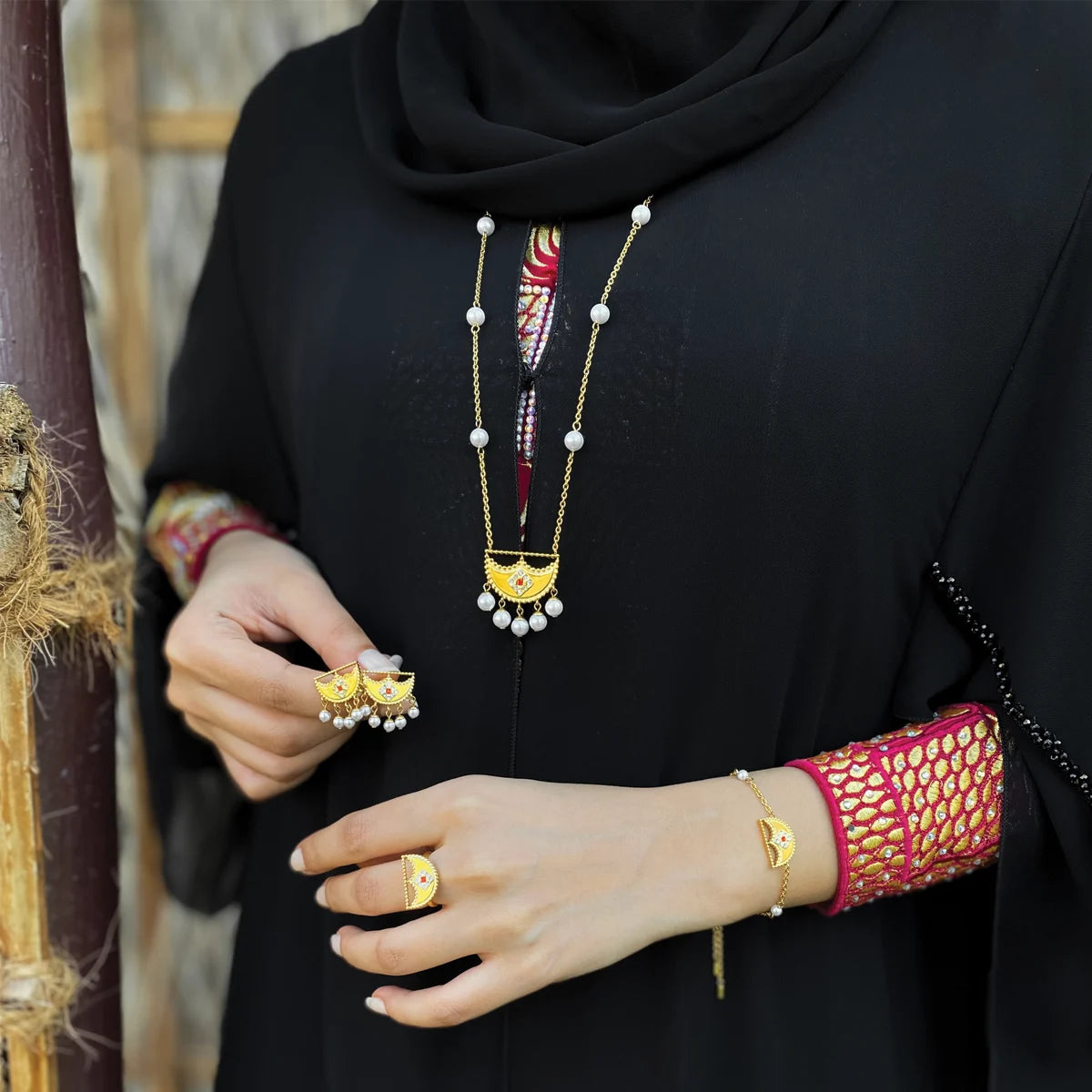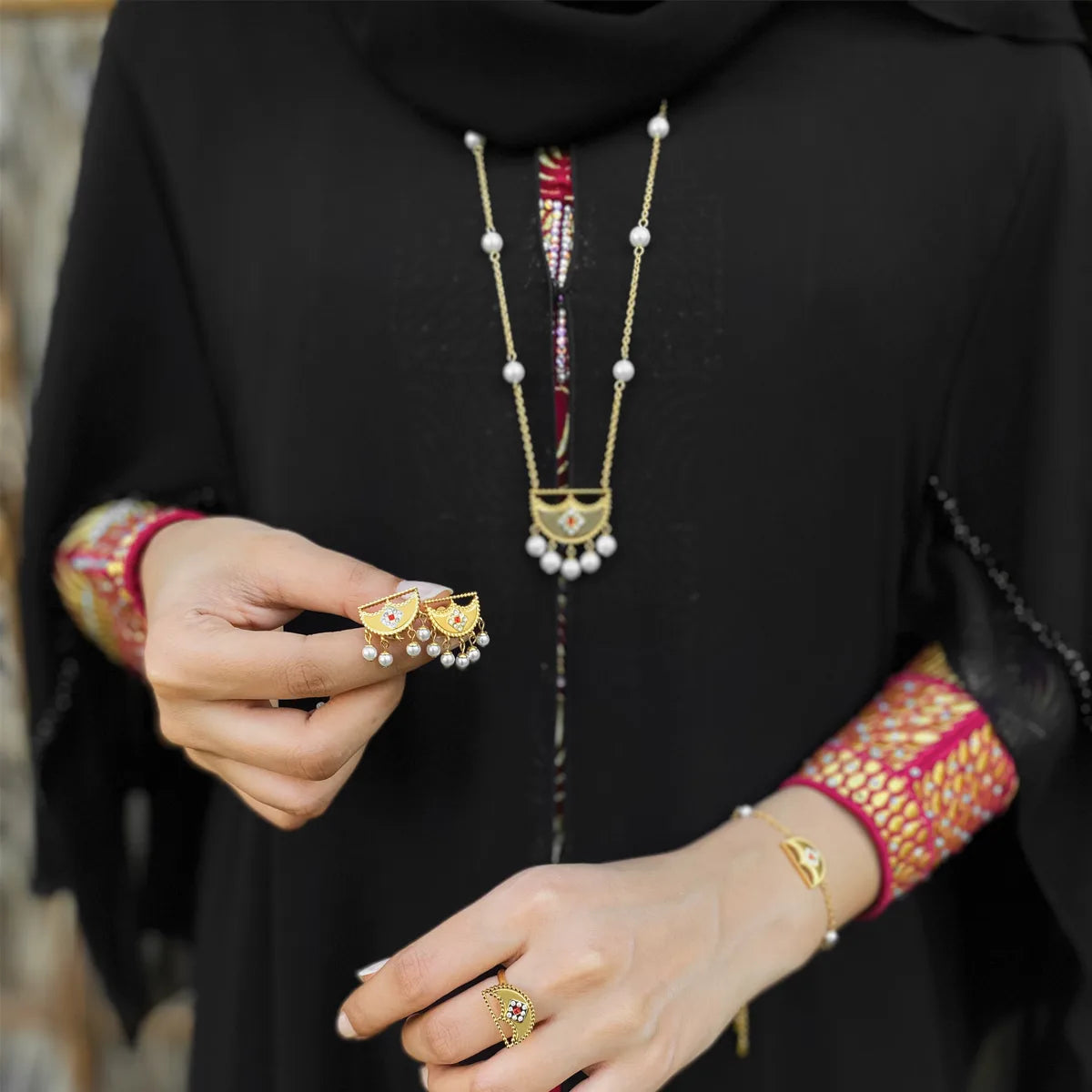 تجمع هذه المجموعة الماضي بالحاضر من خلال لآلئ متدلية برشاقة وكريستالات متلألئة مع أحجار مزدوجة الجوانب مستوحاة من رموز إماراتية أصيلة. تصميم خالد يحتفي بالتراث ويمنح إطلالتك لمسة من الرقي والتألق في كل مناسبة.