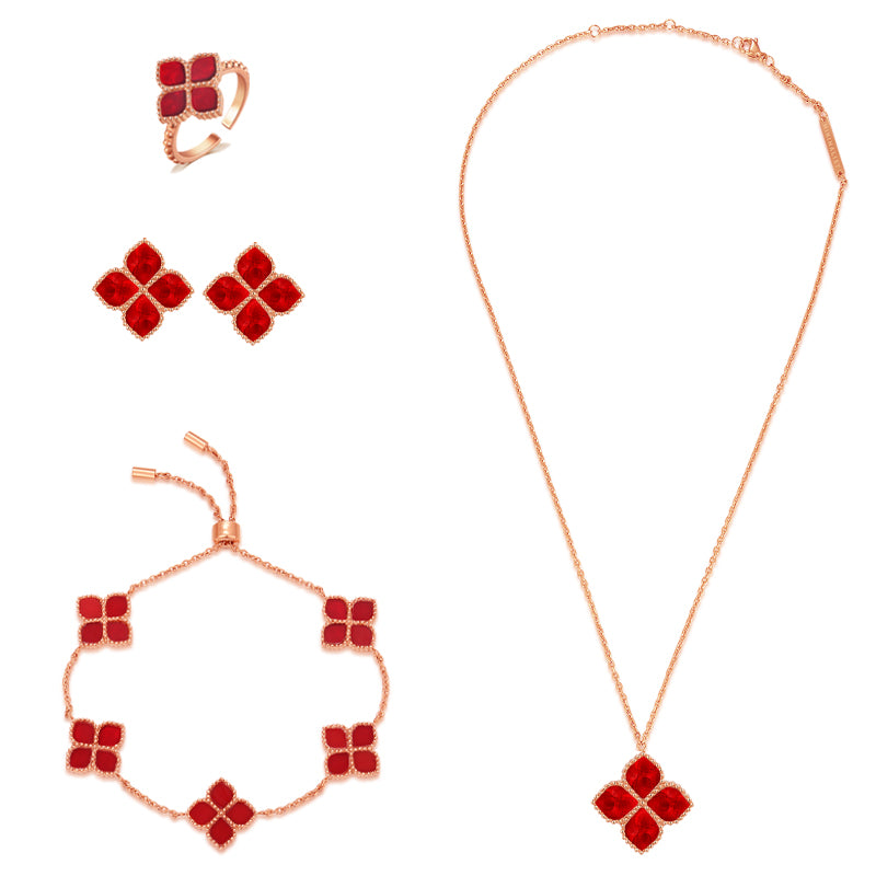 بوزن فائق الخفة وتصميم مريح، يمنحكِ طقم الجوري إحساسًا سلسًا على بشرتكِ. صُنع من مواد لطيفة ومضادة للحساسية، مما يجعله الإختيار المثالي لأناقة تدوم يوميًا.