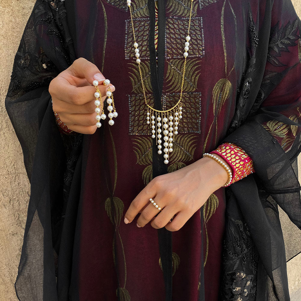 Designed to catch the light and every eye in the room, this set features hanging pearls, and a sparkling chain that adds luxurious dimension. The bracelet, necklace, and earrings move gracefully with you, creating a dynamic and refined look for Eid gatherings.