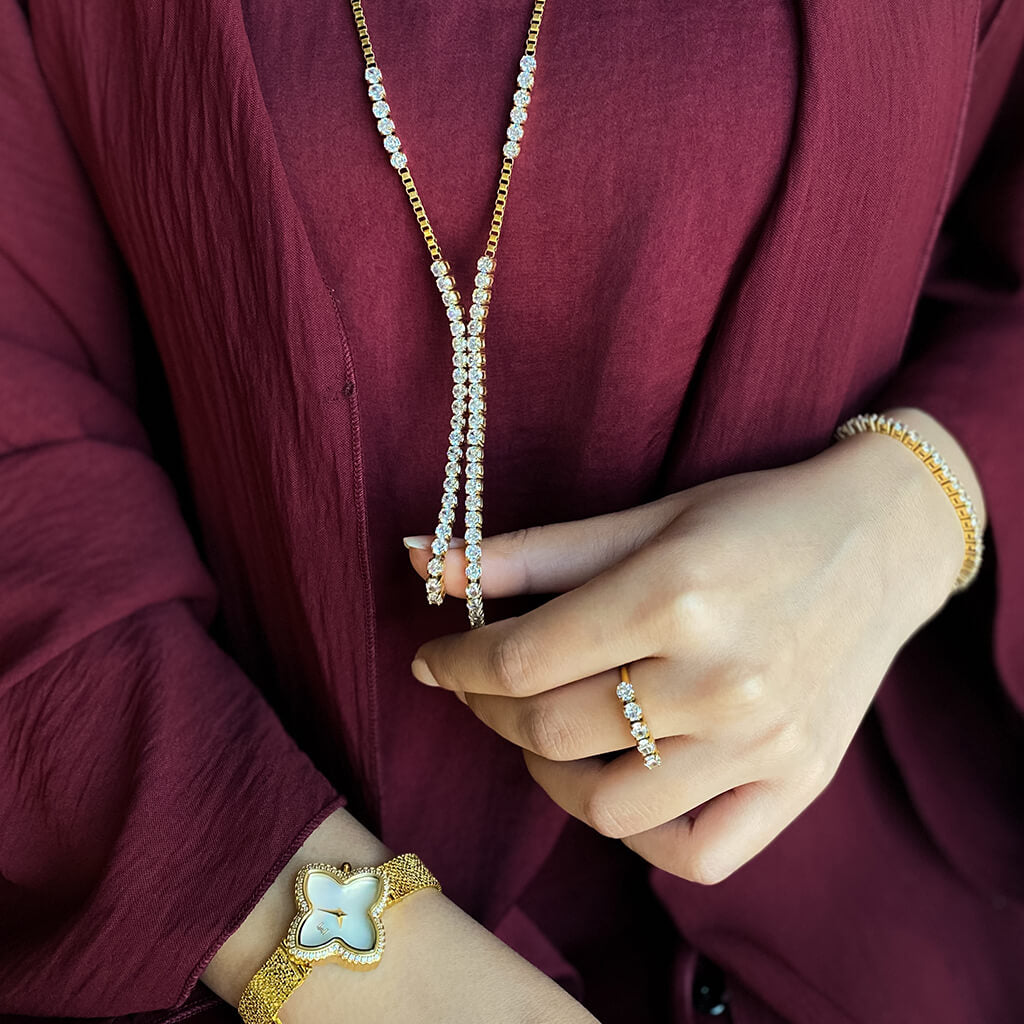 The Tennis Collection is a timeless jewellery set with sparkling stones and an adjustable necklace, offering effortless elegance for any occasion.