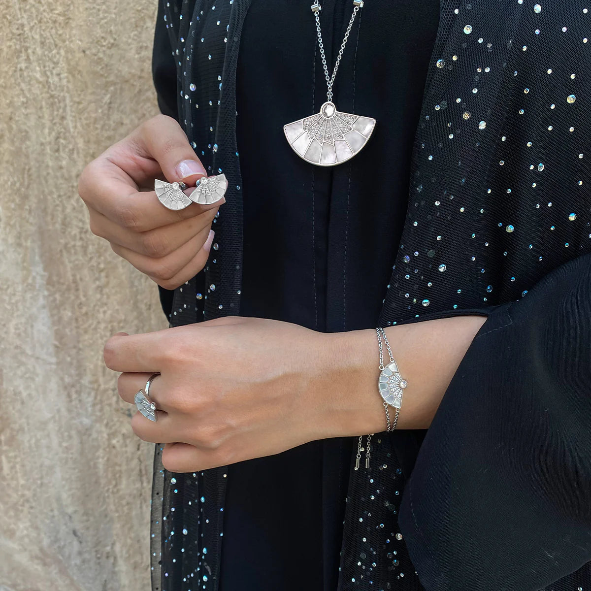 The Fan Collection is a graceful jewellery set that blends luxury with simplicity, featuring a delicate fan motif in mother-of-pearl and sparkling crystals for elegant daily wear and thoughtful gifting.