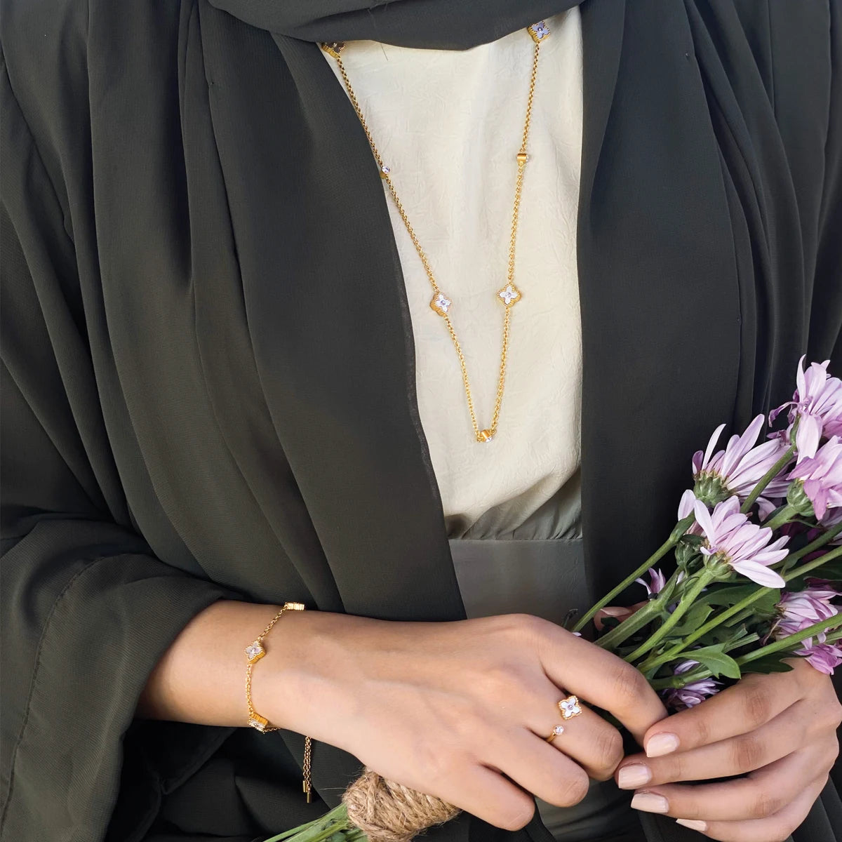 The Mini Joory Collection features a timeless, petite design with four delicate petals and a radiant crystal - crafted for effortless everyday elegance.