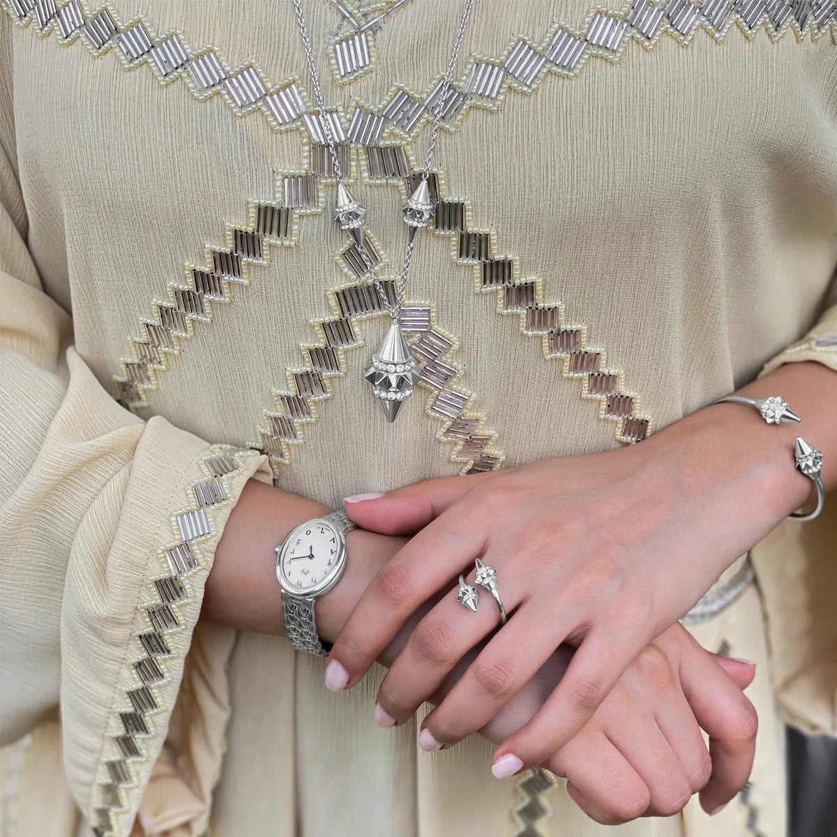 The Turath Collection pays tribute to the artistry of Emirati jewellery, each piece is adorned with intricate detailing, shimmering crystals and superior craftsmanship. The design captures the magic of special occasions, making it a radiant statement for your festive gatherings and to suit all your outfits and abayas.