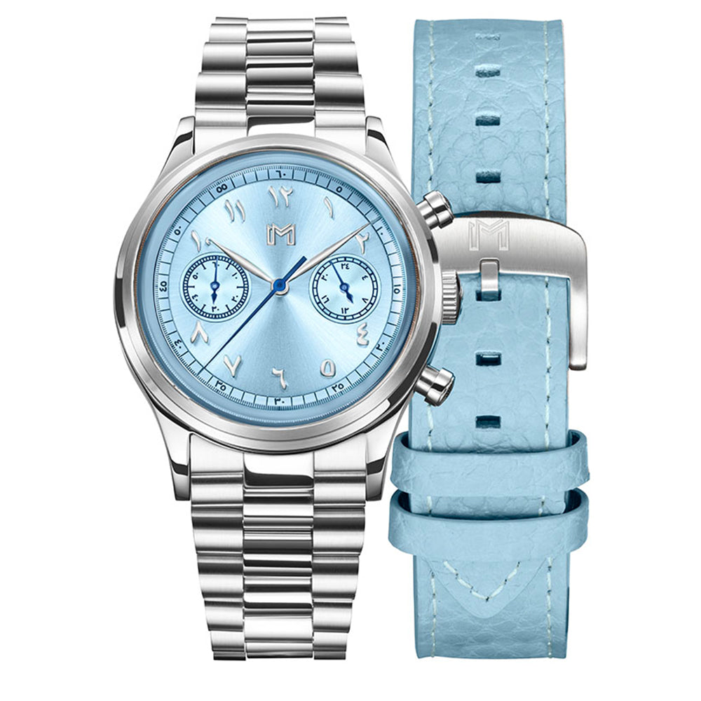 Introducing Ebrahim , a limited-edition addition masterpiece to the Vintage Chrono Collection. This watch features a striking sky blue dial, paired with a premium leather strap. Powered by a Seiko mecha-quartz movement, and a chronograph stop watch function. This collection is reminiscent of vintage racing watches which represents speed and reliability.